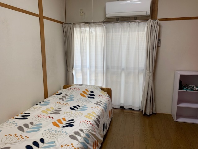 個室設備エアコン、ベッド、机、椅子、ゴミ箱、 カーテン、収納